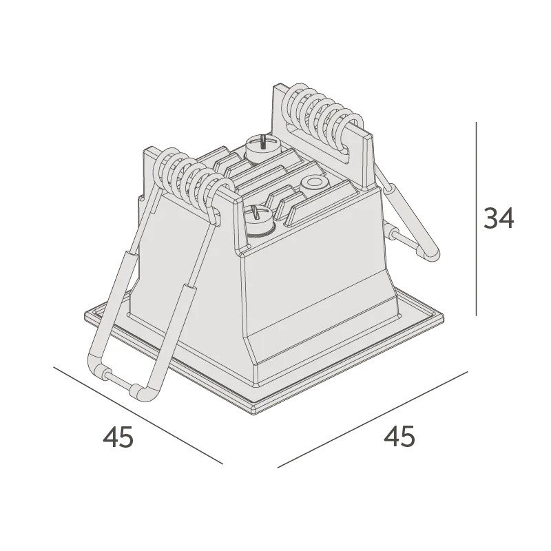 MaterialCorpo em alumínio injetado. Acabamento microtexturizado. Pintura eletrostática a pó poliéster. Refletor em policarbonato metalizado. Recuo em policarbonato. Molas em aço inox.