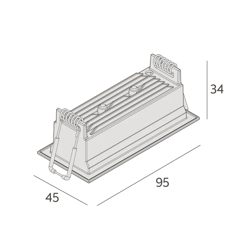 MaterialCorpo em alumínio injetado. Acabamento microtexturizado. Pintura eletrostática a pó poliéster. Refletor em policarbonato metalizado. Recuo em policarbonato. Molas em aço inox.