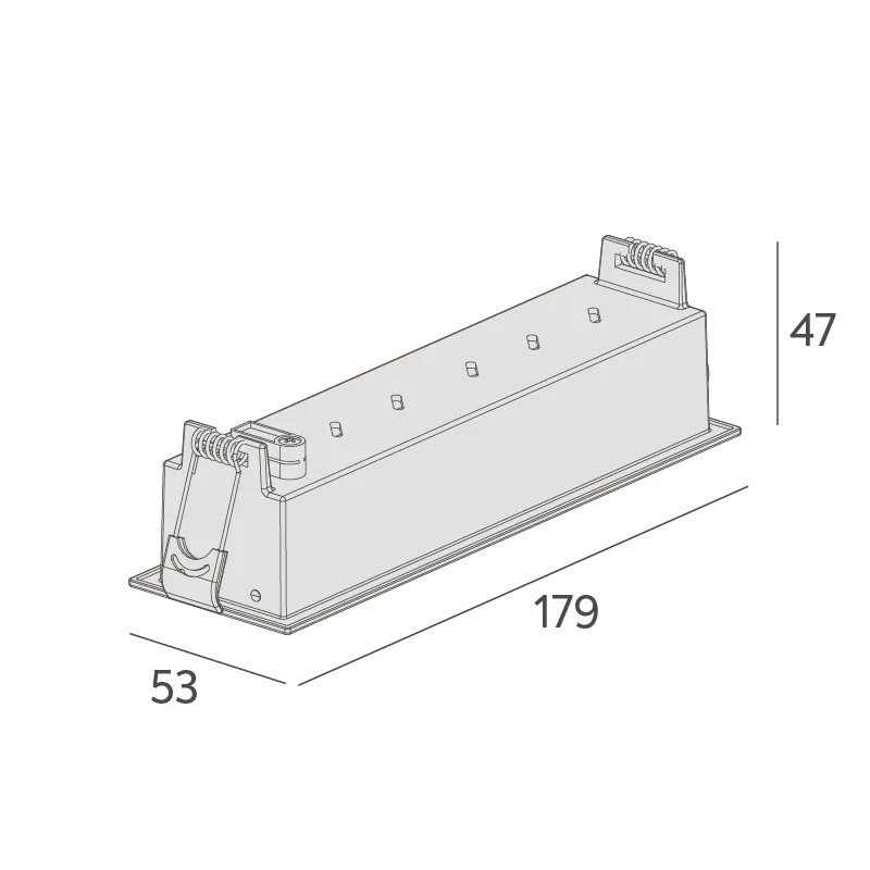 MaterialCorpo em alumínio injetado. Acabamento microtexturizado. Pintura eletrostática a pó poliéster. Refletor em policarbonato metalizado. Recuo em policarbonato. Molas em aço inox.